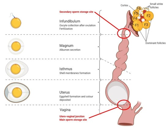 Unlike mammals, the late avian embryo development takes place outside the mother’s uterus. Thus, the egg must contain all the nutrients to allow for embryo development. The oviduct will allow for the formation of the egg but also its fertilization. The avian oviduct is made up of 6 successive anatomical area (Figure 4).