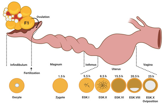 After fertilization, the chicken eggs remain for about 3 h inside the magnum to acquire albumen, 1.5 h inside the isthmus to acquire shell membranes, and 20 h inside the shell gland to acquire a calcium-enriched shell. The zygote undergoes intrauterine embryo development with the initiation of cell division parallel to the egg position in the shell gland (Figure 5). The embryo development in birds, and particularly in chickens, is classified into stages by two major criteria: Eyal-Giladi and Kochav (EGK) criteria [44,45] and Hamburger and Hamilton (HH) criteria [46]. The EGK criteria classifies the intrauterine embryonic development, while the HH criteria classifies the post-ovipositional development in chickens. According to the EGK criteria, intrauterine embryo development in chickens is classified into stages from EGK.I (early cleavage stage) to EGK.X (showing complete formation of the area pellucida and area opaca) (Figure 5). After fertilization, shell formation, and egg laying, there is an incubation period, which varies in length for each species. During incubation, major embryo development occurs that we will not detail here.