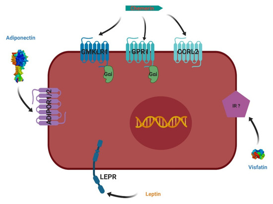 Leptin, adiponectin, visfatin, and chemerin and their receptors.