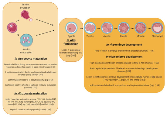 In embryos of mouse, human, bovine, chicken, and rabbit species, leptin is present and has specific spatial localization [121,122,128,156,157,158] (Table 5). In these studies, authors demonstrated that after fertilization, leptin becomes differentially distributed among the inner and outer blastomeres of the morula stage embryo in a pattern that persists with respect to the ICM and trophoblast through the hatched blastocyst stage, suggesting an important role of leptin in early embryo development. In humans, the ratio between leptin and body mass index (BMI) appears to be highly predictive of in vitro fertilization (IVF) success [159]. Still, in humans, the ratio between leptin and adiponectin in follicular fluids of the preovulatory follicles, is related to successful in vitro embryo development [160]. Human endometrium produces leptin and leptin secretion is influenced by the blastocyst [161], suggesting that the actions of leptin may be important during the preimplantation and implantation time windows. Thus, the leptin system may play an important role in the crosstalk between the preimplantation embryo and the receptive endometrium during the human implantation process (Figure 7) [162]. Later, in vitro studies revealed that the addition of recombinant leptin to the embryo culture media promotes the development from 2-cell stage embryos to the hatched blastocysts in mice and humans [125,163]. These results are abolished by using an antibody against the extracellular domain of LEPR. Moreover, results showed that leptin significantly increased the total cell number of blastocysts with a highest effect in the trophectoderm suggesting a paracrine effect of this hormone. However, other studies suggested a contrary role of leptin on embryo development [164]. Indeed, authors showed that significantly fewer leptin-exposed than control embryos hatched by day 5 and by day 6 of development. In addition, cells of leptin-exposed day 5 blastocysts showed a higher rate of DNA fragmentation, which is a sign of apoptosis. These positive and negative effects seem to be dose- and stage-dependent. In sheep, the concentration-dependent regulation pattern was confirmed, although sheep embryos appeared to be more sensitive in responding to leptin [165]. In this same species, food deprivation linked with low leptin production induces lower oocyte quality [166]. In pigs, polymorphism in LEPR gene sequence induced leptin resistance in the Iberian pig breed itself leading to a lower ovulation rate, early embryo loss, and implantation failure of embryos [167]. Another study in pigs demonstrated that embryo development was stimulated when cultured in the presence of leptin, and development was further enhanced when leptin was present during both oocyte maturation and embryo development [168]. In bovine, leptin treatment during oocyte maturation improved developmental potential, resulting in increased development to the blastocyst stage with reduced numbers of apoptotic cells [169]. Further, increased LEPR mRNA levels were detected in blastocysts originating from oocytes treated with leptin. Authors concluded that physiological doses of leptin during oocyte maturation may have long-term effects on the expression of developmentally important genes in early embryos. In chickens, the mRNA expression of leptin receptor was identified in embryonic ovaries [131] as well as in developed ovaries [154,170]. These findings suggest that leptin may contribute in ovarian development during embryogenesis.