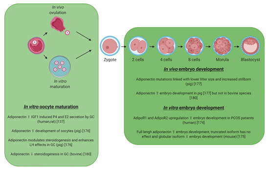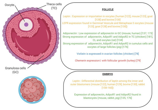 In mammals and birds, the female reproductive functions are dependent on nutritional status and body composition. Indeed, extreme body weight changes affect human fecundity through increasing the probability of anovulation. For example, a rapid decline in fecundity was shown during the Second World War when a military blockade resulted in a fall in rations to the population [1]. In birds, an excessive food consumption in comparison to their needs in immature females leads to an accelerated development of the reproductive system at the time of sexual maturity [2]. This excess of energy decreases the production of functional oocytes due to a dysregulation of the follicular hierarchy [3]. Thus, as in mammals, an alteration of both nutritional status and body composition is associated with reproductive disorders and embryo development failures in birds. This connection between metabolic and reproductive functions involves many signals called energy sensors that bind specific receptors on the cell surface. Among them are adipokines, which are cytokines that are predominantly produced by white adipose tissue (WAT) and include leptin, adiponectin, visfatin/PBEF (Pre-B-cell colony-enhancing factor), and chemerin. In addition to the WAT, some of these adipokines are present and released by endothelial, immune, and reproductive cells. They play important roles in metabolic homeostasis, cellular inflammation, immunity, angiogenesis, and reproductive functions [4,5]. Indeed, some in vitro and in vivo evidence shows that adipokines are able to control ovarian steroidogenesis, late embryo development, including embryo implantation, and fetal growth [4,6,7,8,9,10]. In mammals, many of these adipokine effects have been described in several reviews [4,6,7,8,9,10,11,12]. However, the roles of leptin, adiponectin, visfatin, and chemerin in oocyte maturation, fertilization, and early embryo development (cleavage and blastocyst formation (before implantation in mammals)) have rarely been summarized.