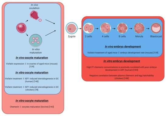 Very little information is available about the role of visfatin in early embryo development. The KO mice for visfatin are not viable since the embryos die at day 10 after conception [187], making harder the study of this adipokine. In vivo study demonstrated that visfatin expression declines in the ovaries of old mice but visfatin administration significantly increases embryo developmental rate (Figure 9) [137]. Visfatin-administered aged mice deliver significantly higher numbers of offspring than controls. Authors suggest the possibility that the promoting effect of visfatin on oocyte quality and fertility may be associated with the stimulation of ovarian angiogenesis. This adipokine has also an indirect beneficial effect on the embryo quality since it has been demonstrated that visfatin increases IGF-1-induced steroidogenesis and cell proliferation [138]. In birds, visfatin is expressed in the ovarian follicles of hens and it has a negative impact on steroidogenesis and P4 production by granulosa cells, and so, it could play a negative role on oocyte maturation [78]. However, until now, there is no evidence that visfatin has a direct action on early embryo development in mammals and birds.
