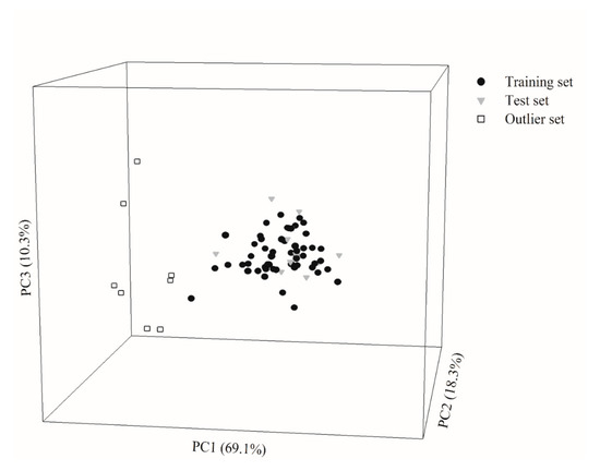 Molecule distribution for the molecules enrolled in this investigation in the training set (solid circle), test set (gray triangle), and outlier set (open square) in the chemical space spanned by three principal components.