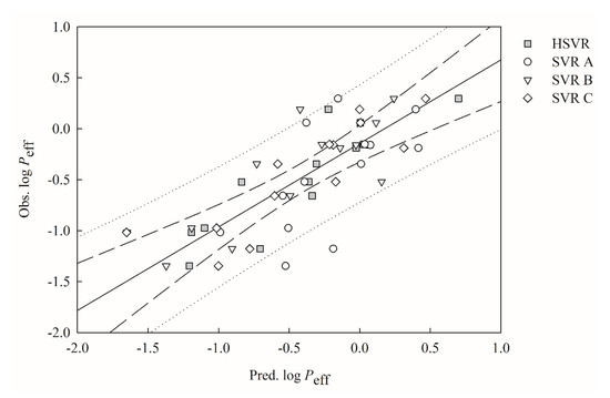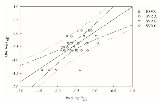 Observed log Peff vs. the log Peff predicted by SVR A (open circle), SVR B (open triangle), HSVR SVR C (open diamond), and HSVR (gray square) for the molecules in the test set. The solid line, dashed lines, and dotted lines correspond to the HSVR regression of the data, 95% confidence intervals for the HSVR regression, and 95% confidence interval for the prediction, respectively.