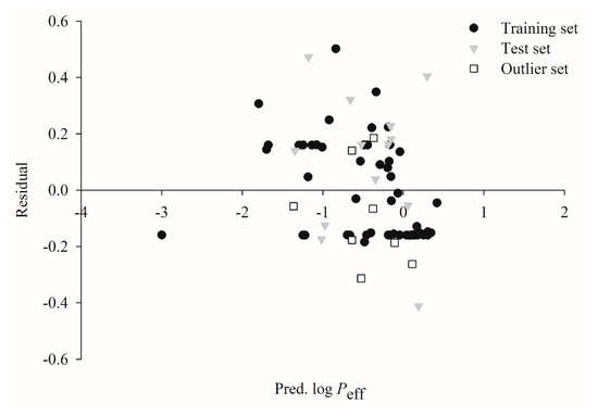 Figure 5 illustrates the scatter plots of the residual vs. the log Peff values predicted by HSVR for the molecules in the training set, test set, and outlier set. It can be conceived that the residuals are approximately evenly allocated on both sides of x-axis along the range of predicted values in all datasets, suggesting that there is no significant systematic error associated with HSVR. The unbiased predictions can be further rendered by its almost negligible average residuals that were 0.00, −0.10, and 0.09 in the training set, test set, and outlier set, respectively (Table S1).