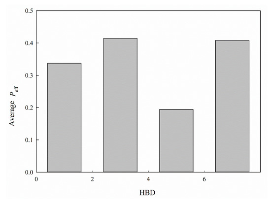 It has been postulated that hydrogen bond, which can be characterized by HBA and HBD, plays a critical role in intestinal P-gp-mediated transport [61] and HBD makes substantial contributions to intestinal permeability when compared with its HBA counterpart [56]. Accordingly, HBD was adopted in this study. Nevertheless, the relationship between HBD and Peff is seemingly obscure, as illustrated by Figure 8, which shows the average Peff for each histogram bin of HBD for all molecules included in this investigation. This peculiar relationship can be plausibly attributed to the fact that the substrates of PepT1 and P-gp, which are the most abundant SLC and ABC transporters, respectively, in jejunum [15], can interact with their transporter proteins via HBD [25,26]. The complexity can be further increased by taking into the account the fact that P-gp inhibitors, modulators, and substrates can interact with P-gp through HBD [26,62,63]. As such, HBD can simultaneously facilitate and hinder intestinal permeability, leading to a perplexing dependency, which, in turn, can create an unsurmountable hurdle for creating a predictive theoretical model regardless of traditional linear or machine learning-based schemes.