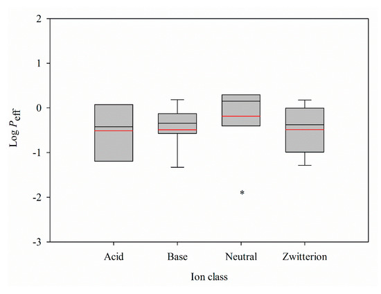 Box plot of log Peff values for different ion classes, where the boxes indicate the distribution of log Peff from the 25th to the 75th percentile, the black and red lines represent the median and mean values, the whiskers depict the minimum and maximum values, and the asterisk denotes significant difference between neutral and the others (p < 0.05).