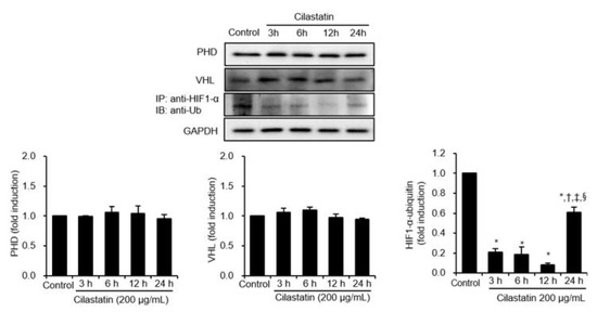 Cilastatin preconditioning upregulated HIF-1α expression via the inhibition of ubiquitination in HK-2 cells. Semiquantitative immunoblotting showed that cilastatin pretreatment did not affect the levels of VHL and PHD expressions. Immunoprecipitation showed that HIF-1α/ubiquitin complex formation was significantly suppressed in cilastatin-treated HK-2 cells compared to control in a time-dependent manner, but it was significantly increased at 24 h after cilastatin pretreatment. The data are presented as means ± SEM. *p < 0.05 vs. control, †,‡,§ p < 0.05 vs. 3 h, 6 h, and 12 h after cilastatin treatment.