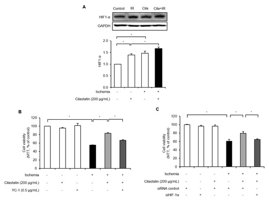 Cilastatin preconditioning protected IR-induced cell death via the activation of HIF-1α in HK-2 cells. (A) Semiquantitative immunoblotting of HIF-1α expression revealed that IR injury upregulated HIF-1α expression and cilastatin pretreatment further enhanced HIF-1α expression in IR-exposed cells. Cilastatin treatment also prevented IR-induced cell death. Co-treatment with cilastatin and (B) HIF-1α inhibitor, YC-1, or (C) HIF-1α siRNA restored cell death similar to those of IR-exposed cells without cilastatin treatment. The data are presented as means ± SEM. * p < 0.05.