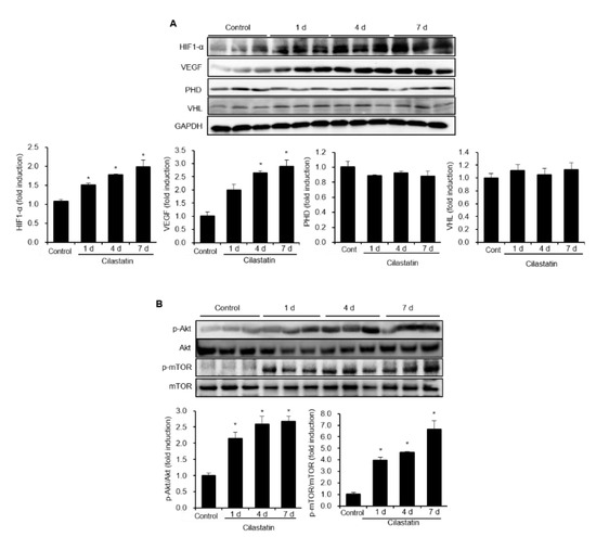 Cilastatin treatment upregulated HIF-1α expression and its upstream and downstream signaling pathways in mouse kidney. (A) Cilastatin treatment enhanced HIF-1α and VEGF expression in a time-dependent manner in mouse kidney, but it did not affect VHL and PHD expression. (B) Cilastatin treatment enhanced Akt and mTOR phosphorylation in a time-dependent manner in mouse kidney. The data are presented as means ± SEM. * p < 0.05.
