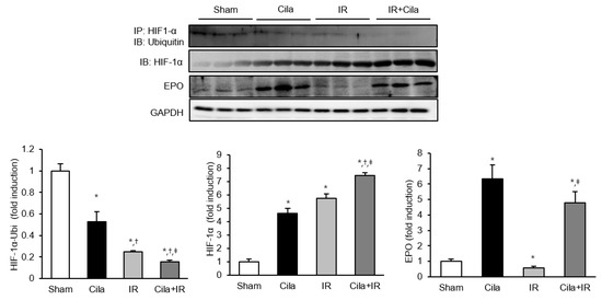 Cilastatin preconditioning upregulated HIF-1α expression and its downstream signaling pathway and decreased the ubiquitination of HIF-1α in mouse kidney with IR injury. Immunoprecipitation showed that HIF-1α/ubiquitin complex formation was significantly decreased in mouse kidney with IR injury compared to sham-operated mice; however, it more significantly decreased in cilastatin-treated mouse kidney with IR injury. Therefore, semiquantitative immunoblotting revealed that HIF-1α expression markedly increased in cilastatin-treated mouse kidney with IR injury compared to other groups. EPO expression was significantly increased in cilastatin-treated mouse kidney and was decreased in mouse kidney with IR injury; however, it increased in cilastatin-treated mouse kidney with IR injury. The data are presented as means ± SEM.* p < 0.05 vs. sham group; † p < 0.05 vs. Cila group; ‡ p < 0.05 vs. IR group.