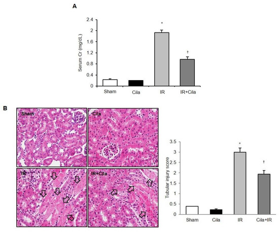 Cilastatin preconditioning improved renal function and tubular necrosis in mouse kidney with IR injury. (A) Serum creatinine levels were significantly increased at 24 h after IR injury compared with serum creatinine levels in sham-operated mice. Cilastatin pretreatment improved serum creatinine level in mouse kidney with IR injury. (B) The representative staining with hematoxylin and eosin showed a decreased tubular necrosis (arrows) in the cilastatin-treated mouse kidney with IR injury compared with mouse kidney with IR injury not treated with cilastatin (original magnification, × 200). The data are presented as means ± SEM. * p < 0.05 vs. sham and Cila group; † p < 0.05 vs. IR group.