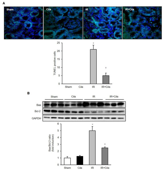 The number of terminal deoxynucleotidyl transferase-mediated dUTP nick end-labeling (TUNEL)-positive cells was increased in mice with IR injury compared to those of sham-operated mice, and it was decreased in cilastatin-treated mice with IR injury (Figure 8A). IR injury increased the expression of the proapoptotic protein Bcl-2-associated X (Bax) and decreased the expression of the antiapoptotic protein B-cell lymphoma 2 (Bcl-2). Cilastatin preconditioning significantly attenuated Bax levels and increased Bcl-2 expression in ischemic mouse kidney (Figure 8B).