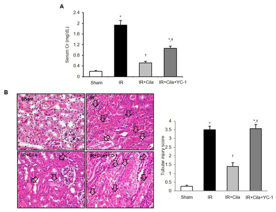 Cilastatin attenuates renal dysfunction in mouse kidney with IR injury, and co-treatment with YC-1 restored IR injury to a great extent (Figure 9A). The quantitative tubular necrosis score of YC-1 co-treated ischemic mouse kidney was significantly higher than that of the mouse kidney treated with only cilastatin (Figure 9B).