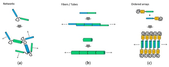 | Unbounded nanostructures | Network | ~500 nm ~50–100 nm | Coiled-coil fusion Modification | [46,47,48] |