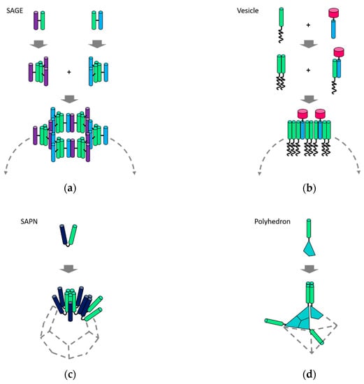 | Polyhedron | ~16–24 nm~18–25 nm | Coiled-coil fusion Fusion to other domains | [36,37,44] | |