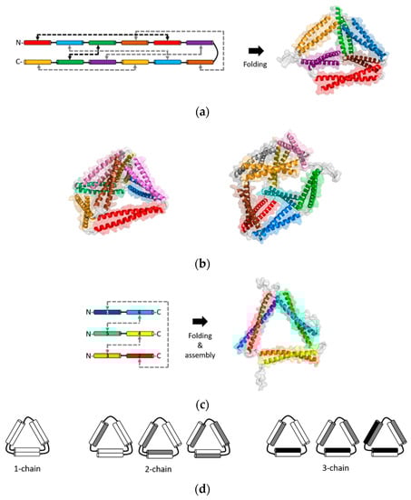- Thomson, A.R.; Wood, C.W.; Burton, A.J.; Bartlett, G.J.; Sessions, R.B.; Brady, R.L.; Woolfson, D.N. Computational design of water-soluble α-helical barrels. Science 2014, 346, 485–488. [Google Scholar] [CrossRef] [PubMed]