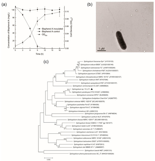 (a) Bisphenol A (BPA) degradation by strain YC-JY1 and growth curve. (b) The morphological characteristics of strain YC-JY1 observed by a transmission electron microscope. (c) Phylogenetic tree based on 16S rRNA gene sequence analysis of strain YC-JY1 and other Sphingobium genus strains. Sphingobium sp. YC-JY1 was marked using a dark triangle.