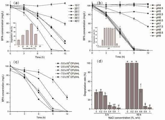 Effect of (a) temperature; (b) pH; (c) inoculums density and (d) NaCl concentration on biodegradation of BPA. The error bar value presents the standard deviation of triplicates. Inset shows BPA biodegradation efficiency at 9 h on different (a) temperature and (b) pH value. Different letters indicate statistically significant differences at p ≤ 0.05; similarly hereinafter.