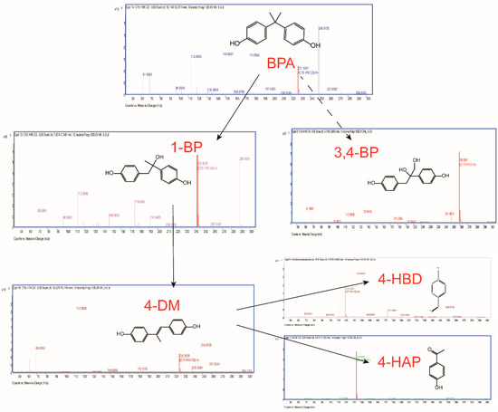 Degradation metabolites of BPA by strain YC-JY1 using HPLC-QTOF-MS/MS.