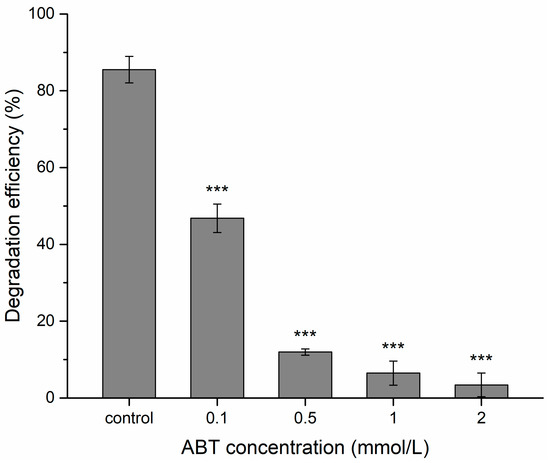 Effect of cytochrome P450 inhibitor ABT on BPA degradation by Sphingobium sp. YC-JY1 after 9 h of incubation. *** p < 0.001 indicates an extremely significant difference compared to the control.