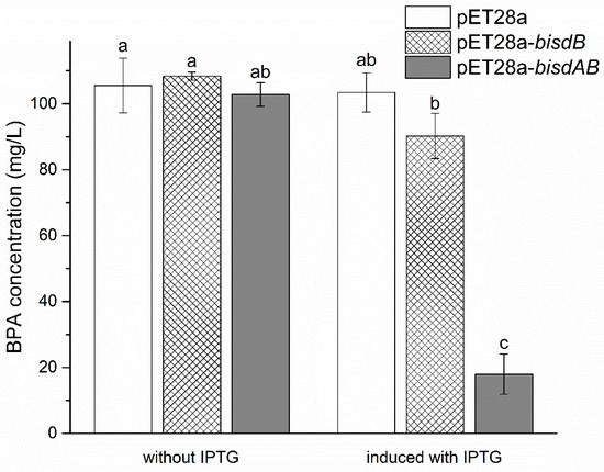 BPA degradation by pET28-bisdB and pET28-bisdAB recombinant cells after 24 h of incubation in Luria-Bertani (LB) medium. The different letters (a–c) represent significant differences at p ≤ 0.05.