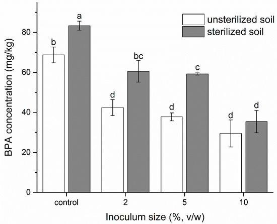 Decontamination of BPA-contaminated soil by inoculating Sphingobium sp. YC-JY1. The different letters (a–d) represent significant differences at p ≤ 0.05.