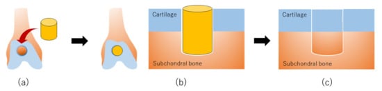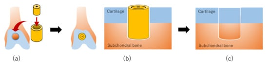 Using a surgical trephine with an outer diameter of 4 mm, articular cartilage and subchondral bone were drilled to a depth of 6 mm at the center of the groove in MMPigs [39]. After removing a column of cartilage and bone, a cylindrical osteochondral defect was created in each groove (Figure 2a) [39]. The columnar construct was autografted into the osteochondral defect in the right hind limb (Figure 2b), whereas no graft was implanted into the defect in the left limb as control defects [39]. Alternatively, the surgery was performed under general anesthesia to create a cylindrical osteochondral defect (5 mm in depth) at the center of the groove using a bone chisel with an outer diameter of 5.2 mm in minipigs (Figure 2a) [40]. The columnar construct was carefully autografted into the osteochondral defect in one of the two defects as an implanted defect (Figure 2b), and nothing was implanted into the second defect as a control [40]. Pigs were scanned by computed tomography (CT) every 3 months following implantation and then euthanized at 24 or 48 weeks to confirm the osteochondral regeneration process by macroscopic and histological evaluation [39].