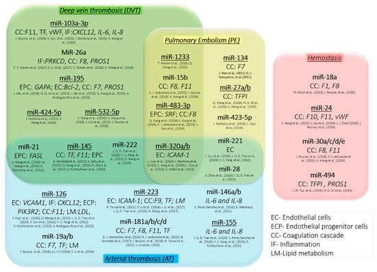 The current studies have highlighted some miRNAs that are essential in thrombosis and hemostasis. As shown in Figure 1, numerous reports indicate a clear association between dysregulation of miR-145, miR-320a/b and miR-222 on thrombosis. Moreover, some miRNAs are linked to specific types of thrombosis, and may thus serve as potential biomarkers or therapeutic targets. For example, miRNAs strongly corelated with deep vein thrombosis such as miR-103a, miR-26 or miR-195 dysregulate protein critical in coagulation factors or target proteins essential for endothelial progenitor cells. Pulmonary embolism is linked with dysregulation of miR27a/b that target tissue factor inhibitor. On other hand, miR-126 or miR-223 that are linked to arterial thrombosis target proteins that cause endothelial dysfunction, alternation of lipid metabolism or trigger inflammation and target ICAM-1, VCAM-1, IL-6 or IL-8. In addition, four miRNAs: miR-18, miR-24, miR-30a/c/d/e and miR-494 has been shown to dysregulate key proteins involved in hemostasis. While these miRNAs have not been linked with thrombosis, they are associated with bleeding disorders. Bleeding disorders and thrombosis can both result from disturbed hemostasis; i.e., decreased and enhanced expression of coagulation proteins respectively. Consequently, we may expect that the reverse dysregulation of these miRNAs may trigger thrombotic event.