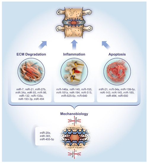 This review aims to provide a comprehensive overview of the past five years of literature on miRNAs associated with degenerative disc pathology. Particular attention will be paid to the dysregulation of miRNAs and their role in regulating the hallmarks of IVD disease, namely ECM degradation, apoptosis, and inflammation, as well as mechanobiology as an overarching theme (Figure 1).