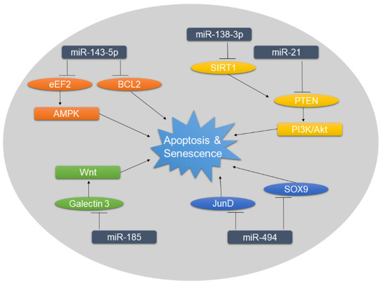 Overview of miRNAs associated with increased rates of apoptosis and senescence in DDD. Targets of negative miRNA regulation are shown in ellipses. The dysregulation of miRNAs and subsequently of their targets influence the downstream signaling, ultimately promoting apoptosis and senescence.