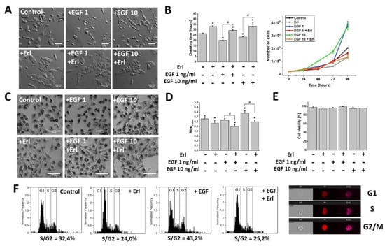 EGF has long been shown to affect the development of GBM []. Indeed, microscopic analyses revealed noticeable phenotypic shifts towards a spindle-like (mesenchymal) morphology in the T98G cell populations exposed to the EGF (1 and 10 ng/mL). Interestingly, EGFR inhibition by Erlotinib (Erl) entirely promoted the epithelial phenotype in both the EGF-treated and non-treated cell populations. These effects were accompanied by a pronounced dose-dependent pro-proliferative activity of the EGF (Figure 1A,B). Furthermore, microscopic and spectrophotometric experiments revealed intensified MTT substrate processing in the cells exposed to 48 h EGF treatment. This was manifested by a considerable accumulation of formazan crystals within the intracellular space (Figure 1C,D). Concomitantly, the effects of EGF on the cell morphology, proliferation, and metabolism were inhibited by erlotinib administration (Erl, a chemical inhibitor of the EGF receptor (EGFR); Figure 1A–D). Notably, no cytotoxic/pro-apoptotic effects of EGF/Erl were observed, as demonstrated by ca. 100% cell viability in all experimental variants (Figure 1E). This notion was confirmed by the DNA content analyses, which showed a strong pro-mitotic activity of the EGF, illustrated by a prominent increase of S and G2/M fractions after 24 h EGF treatment (Figure 1F). Again, the inhibition of EGFR signaling by Erl resulted in G1 arrest of GBM cells. These data show that EGF induced proliferation and an invasive morphology of GBM cells in an EGFR-dependent manner.