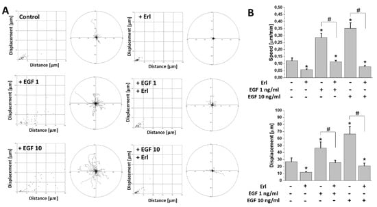 EGF augmented migration activity of GBM cells in vitro. (A) The effect of 72 h exposure of GBM cells to EGF and/or Erl. Dot plots represent displacement (X axis) and total length of trajectory (Y axis) calculated for single analyzed cells. Circular plots depict trajectories of individual cells. (B) Quantitative analysis of parameters (speed, displacement) describing efficiency of cells’ migration activity changes in examined conditions. Note the highly pronounced stimulation of cellular motility by EGF. Bars represent S.E.M.; n = 40. Statistical significance was calculated with non-parametric Mann–Whitney test, * p < 0.05 vs. control; # p < 0.05 vs. reference condition.