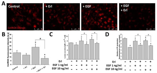 Effect of EGF on cellular redox and bioenergetic status modulation. (A,B) EGF (10 ng/mL) promoted mitochondrial (mt) ROS production. Measurements were performed with CellROX Orange reagent. (C,D) EGF noticeably affected the efficiency of lactate/ATP biosynthesis in GBM cells. Note that all of the abovementioned phenomena were attenuated by EGFR inhibition with erlotinib. Bars represent S.E.M, n = 40 cells. Statistical significance was calculated with non-parametric Mann–Whitney test, * p < 0.05 vs. control; # p < 0.05 vs. reference condition. Scale bars = 75 µm.