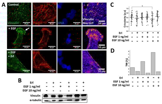 To further examine the mechanisms underlying the pro-invasive effects of the EGF, we performed detailed microscopic analyses of the actin cytoskeleton architecture in the EGF-treated cells. TIRF (Total Internal Reflection Fluorescence) microscopy revealed a substantial remodeling of F-actin filament architecture and focal adhesions within the T98G cells in response to the EGF (10 ng/mL) treatment. In particular, spindle-like (mesenchymal) cells with less prominent stress fibers, but pronounced F-actin polymerization regions in the leading edges were observed (Figure 4A). Moreover, dispersed aggregates of vinculin instead of vinculin + plaque-like structures were present in the leading edges of the EGF-stimulated GBM cells (Figure 4A). This phenomenon was correlated with the significant decrease of cellular circularity at the population level after 72 h EGF (10 ng/mL) exposure (Figure 4C), and with the prominent increase of the T98G transmigration potential (TMI; Figure 4D). Interestingly, leading-edge formation (Figure 4A) and the induction of T98G invasiveness (Figure 4D) were abolished by Erl in the EGF-treated T98G cells. Erl treatment also led to the disorganization of the F-actin cytoskeleton and focal adhesions’ sides, accompanied by their morphological switch into an epithelioid phenotype. In turn, the Western blot analysis did not reveal any changes in the intracellular vinculin levels under EGF/Erl stress (Figure 4B). Collectively, these observations confirmed the involvement of EGFR-dependent signaling in determination of T98G cell invasiveness.