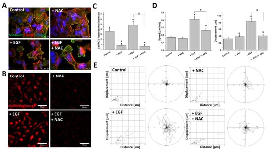 Finally, we focused on the significance of ROS upregulation for EGF-induced T98G invasiveness. Interestingly, the administration of N-Acetyl-L-cysteine (NAC; 1 mM) did not abolish the EGF-induced morphological changes of the T98G cells and did not inhibit the pro-invasive remodeling of the F-actin cytoskeleton (Figure 5A). On the other hand, NAC remarkably attenuated the EGF-induced upregulation of ROS (Figure 5B,C). This effect was accompanied by a significant inhibition of the EGF-induced T98G motility. At the population level, this was illustrated by a decrease of the average speed of motility and displacement of the EGF/NAC-treated cells (Figure 5D). Accordingly, single cell trajectories of EGF/NAC-treated cells clearly demonstrated a retardation of their motility in comparison to the EGF-stimulated cells (Figure 5E). Notably, NAC had a negligible impact on T98G motility when administered alone (Figure 5D,E). These data show the cooperation of the ROS-dependent and ROS-independent EGFR-dependent pathways that regulate T98G motility and cytoskeleton architecture, respectively.