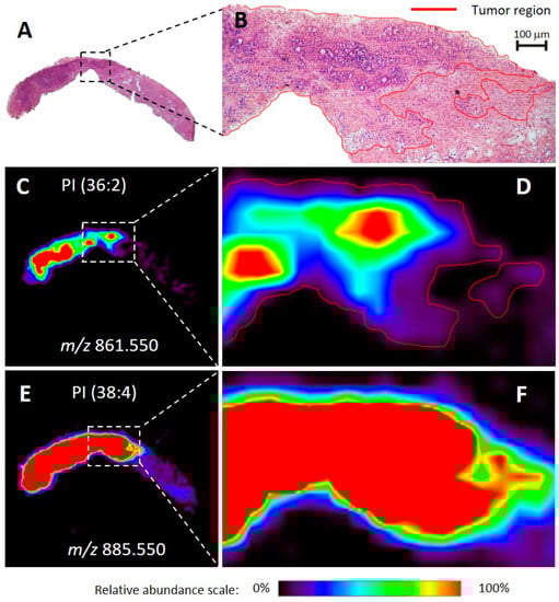 Figure 1. Optical images of hematoxylin & eosin (H&E) stained slides and representative ion images for a biopsied tissue sample diagnosed as invasive apocrine carcinoma of the breast with a signet ring. The entire tissue section is shown in (A) and the optical magnification (40×) of a region is shown in (B), with red-marked tumor areas. The representation of the relative abundance of a tumor discriminatory ion of mass-to-charge ratio (m/z) 861.550 is shown in (C). Zoomed in and outlined in red, (D) shows a comparative perspective with the H&E image above (B). The representation of the relative abundance of a non-discriminatory ion of m/z 885.550 is shown in (E). Also, zoomed-in, (F) shows a comparative perspective with images D and B above. Areas of red intensity within the ion images represent the highest (100%) and black the lowest (0%) relative abundance. PI: glycerophosphoinositol. Lipid species are described by the numbers of fatty acid chain carbons and double bonds.
