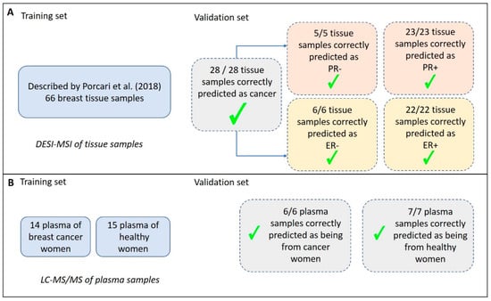 Figure 2. Summary of the classification predictions of breast carcinoma tissue and plasma samples. (A) Results obtained for tissue analysis using DESI-MSI (Desorption-Electrospray-Ionization—Mass Spectrometry Imaging). A previously validated model for classification of samples was described by Porcari et al. [28], with 66 breast cancer samples compared to normal breast tissue, and it was used here as a test set. In the validation set, all the NST (no special type) and special type tissue samples were correctly classified as being cancer and as having +/- Progesterone Receptor (PR) and +/- Estrogen Receptor (ER). (B) Describes the results obtained for plasma analysis using LC-MS/MS (Liquid Chromatography—tandem Mass Spectrometry). The test set was composed of 29 plasma samples and resulted in average accuracies of 99.8% (positive ion mode) and 99.2% (negative ion mode) based on 100 cross-validations. In the validation set, including 30% of the samples, all the plasma samples were correctly classified as being cancer or not.