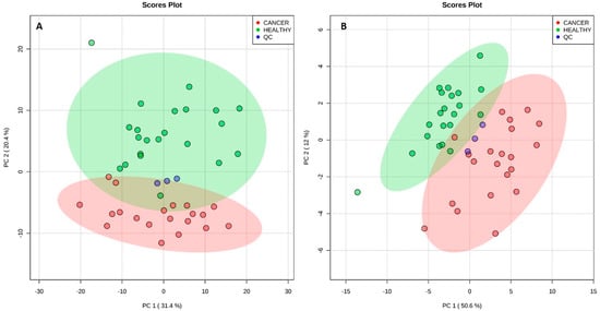 Figure 3. Principal component analysis (PCA) scores plot for plasma analysis in positive ion mode (A) and in negative ion mode (B). Segregation was observed for both modes between cancer and healthy individuals. Quality control (QC) samples (pool of all the samples) are also plotted. The explained amount of the total variance of the full data set is shown for each principal component (PC1-2).