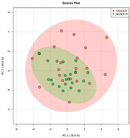 Figure 4. Principal component analysis scores-plot of the differentiation of plasma samples analyzed by LC-MS/MS (Liquid Chromatography—tandem mass spectrometry) using the molecules found in both plasma and tissue by DESI-MSI (Desorption-Electrospray-Ionization—Mass Spectrometry Imaging) [28]. The set of selected features does not enable group differentiation. Principal component (PC) 1 explains 33.3% of the total variance of the full data set, whereas PC2 explains 25.7%.