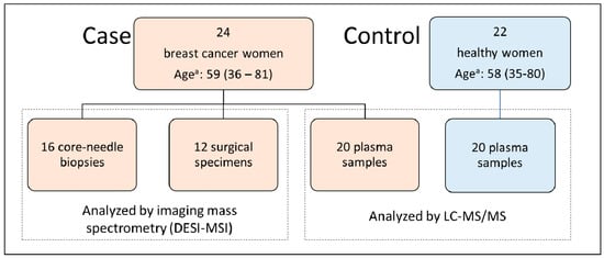 Figure 5. Distribution of samples over case and control groups and the technique of choice employed in each subset: Desorption-Electrospray-Ionization—Mass Spectrometry Imaging (DESI-MSI) for tissue samples and Liquid Chromatography-Tandem Mass Spectrometry (LC-MS/MS) for plasma samples. a Age is expressed as medium age (range).