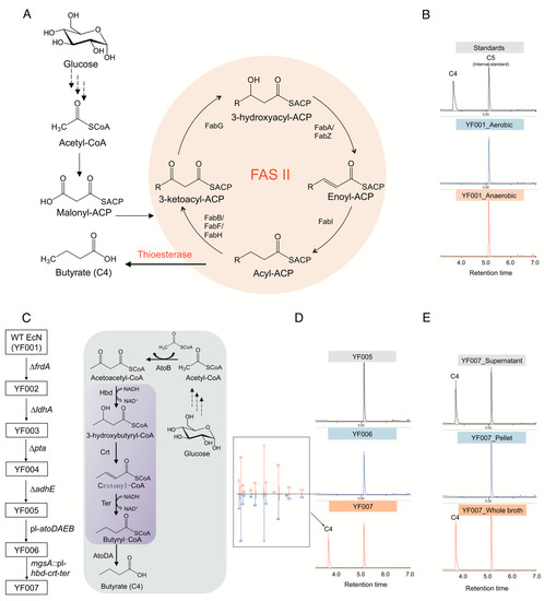 The type II fatty acid biosynthetic (FAS II) pathway has been recognized as the primary route for fatty acid production in E. coli (Figure 1A). However, we found that wild-type EcN does not natively produce detectable butyrate under either aerobic or anaerobic conditions (Figure 1B).