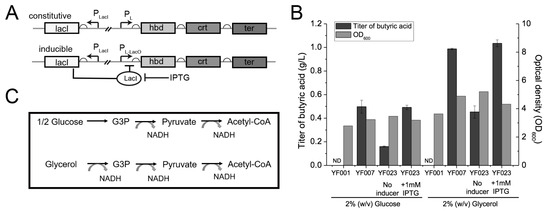 Overproduction of SCFAs can cause toxicity to the host strain [40,41], leading to membrane damage, and thus compromising the host strain’s performance. Therefore, we used an inducible expression system to express the C4 synthesis pathway. Specifically, a lacO operator was inserted between the PL promoter and the open reading frames (ORFs) of the hbd-crt-ter gene cluster in YF007 to obtain isopropyl β-D-1-thiogalactopyranoside (IPTG)-dependent PL-lacO for inducible expression in strain YF023 (PL-lacO-hbd-crt-ter) (Figure 2A). Next, both systems were characterized for C4 production. When characterized in LB containing 2% (w/v) glucose, no significant increases in cell density or C4 titer were observed (Figure 2B). Specifically, YF023 produced 0.49 ± 0.02 g/L C4, which is comparable to YF007 (0.50 ± 0.06 g/L).