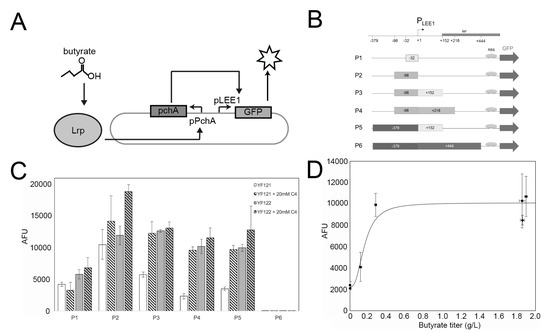 Nakanishi et al. discovered that toxin secretion in the enterohemorrhagic E. coli strain O157:H7 (Sakai) is responsive to butyrate concentration [43]. Briefly, they found that the native E. coli leucine-responsive regulatory protein (Lrp) forms a binary complex with C4, which can bind to the promoter region of pchA (PpchA) and then initiate the transcriptional expression of pchA. The PchA regulator is able to bind to the promoter of the locus of enterocyte effacement (PLEE1), activating transcription of the ler gene under control of PLEE1 [44] (Figure 3A). Inspired by this finding, here we employed these interactions and attempted to develop the C4 biosensor by replacing the E. coli ler gene by the gfp gene, which encodes a green fluorescent protein (GFP) reporter under the PLEE1 promoter. Herein, we amplified the necessary parts from O157:H7 genomic DNA to create recombinant plasmid pDMB-PpchA-pchA-PLEE1-gfp (Figure 3B). Additionally, it should be noted that the precise PchA binding site to the PLEE1 promoter is still unclear [44]. Therefore, we synthesized intergenic regions of different lengths as PLEE1 candidates (−32 bp, −98 bp, −98 + 152 bp, −98 + 218 bp, −379 + 152 bp, −379 + 444 bp), creating 6 plasmids (pC4S-P1 to pC4S-P6, Figure 3B). The engineered non-butyrate-producing strain YF006 (YF 005 PL-atoDABE) and butyrate-producing strain YF007 (YF 005 PL-atoDABE, PL-hbd-crt-ter) were initially used as the host strains for sensor system testing. However, initial results showed that although the GFP signal was successfully detected in expression strain YF007, it is not obviously distinct from YF006.