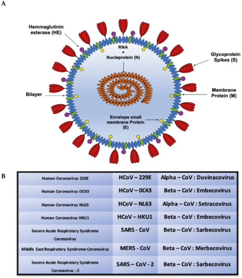 (A) Structure of the coronavirus. (B) The 7 Coronaviruses known to infect humans.