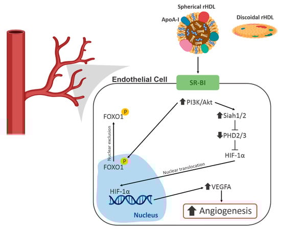 Specifically, Tan et al. found that rHDL rescued diabetes-impaired angiogenesis in two murine models of hindlimb ischaemia and wound healing. rHDL was shown to stabilise HIF-1α in high glucose by suppressing the PHD2 and three proteins, leading to an increase in the expression of VEGFA and rescuing high glucose-impaired tubulogenesis in vitro [3].