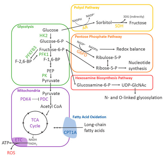 Once a cell begins to accumulate ROS through this mechanism, an additional cascade of events begins. Excess ROS damages a cell’s DNA, which can lead to aberrant transcription of various proteins. One specific protein that is aberrantly activated by ROS-induced DNA damage in endothelial cells is poly-ADP-ribose polymerase 1 (PARP1) [61]. PARP1 post-translationally modifies proteins to inactivate them, and one relevant target is the glycolytic enzyme glyceraldehyde-3-phosphate dehydrogenase (GAPDH) [61,62,63]. When GAPDH is inactivated in this manner, it causes a blockade in the glycolytic pathway which allows for the accumulation of intermediates that cannot flow further through glycolysis. With the known effect of hyperglycaemia on G6PD keeping these intermediates from being shunted to a useful pathway, such as the oxPPP, the intermediates instead increase flux through upstream pathways which are detrimental to cellular function and known to be increased in diabetic endothelial cells: the polyol pathway and hexosamine biosynthesis pathway (HBP).