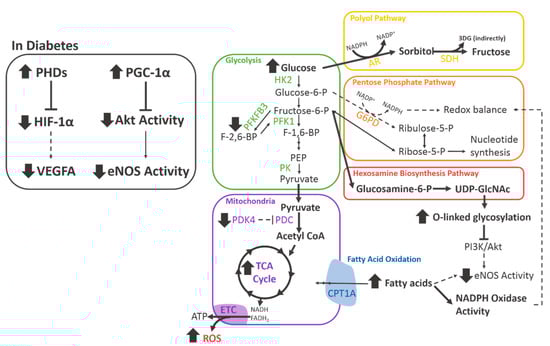 The prevailing hypothesis regarding diabetes-impaired angiogenesis is that hyperglycaemia causes increased production of reactive oxygen species (ROS), which leads to general endothelial cell dysfunction. However, this is only one aspect of the complex pathology. Diabetic hyperglycaemia also negatively affects individual transcription factors, signalling molecules, and metabolic enzymes, which contribute to endothelial cell dysfunction and impaired angiogenesis. The HIF-1α/VEGFA hypoxia signalling pathway is a clear example of this. Furthermore, ROS production is closely tied to cellular metabolism, as we have discussed previously. Therefore, changes in cellular metabolism elicited by diabetes potentially underpin the increase in ROS production. Mitochondrial respiration is a major source of ROS, and several glycolytic side pathways contribute to cellular redox balance. The relationships between these pathways are complex, and it is difficult to tell from where the negative effects on angiogenesis stem.