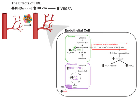 Taken together, these studies highlight that rHDL regulates multiple aspects of pro-angiogenic signalling pathways to achieve a positive effect or ‘rescue’ of diabetes-impaired angiogenesis. However, given the complexity of diabetes and the associated vascular complications, it is necessary to fully understand the breadth of effects had by rHDL to develop it as a potential therapeutic agent. The HIF-1α/VEGFA hypoxia signalling pathway is well-characterised and considered the main driver of ischaemia-induced angiogenesis. HDL has been implicated in multiple steps of this pathway. The response elicited by this pathway in endothelial cells is complex, and an orchestration of many different factors is required for the cells to respond to hypoxia and participate in angiogenesis correctly. Endothelial cell metabolism and the pathways which reprogram it in response to hypoxia are fast emerging as drivers of angiogenesis in their own right. HDL is also emerging as a regulator of this, supporting its already diverse effects on endothelial cells and angiogenesis.