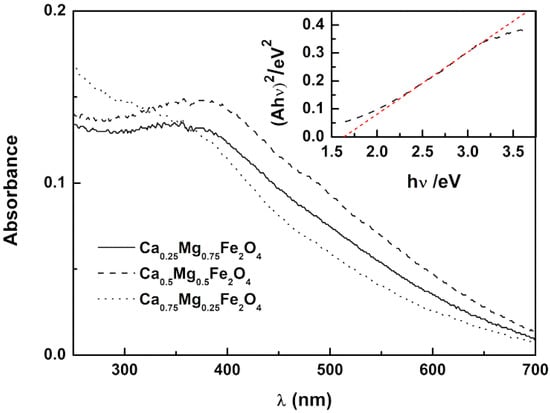 Absorption spectra of Ca0.25Mg0.75Fe2O4, Ca0.50Mg0.50Fe2O4, and Ca0.75Mg0.25Fe2O4 magnetic nanoparticles. Inset: Tauc plot for Ca0.50Mg0.50Fe2O4 nanoparticles, as an example (red line is the linear fitting).